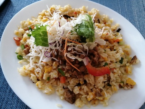 帰省の実家は、民泊がわり タコとエビのサラダ 梨のお知らせ
